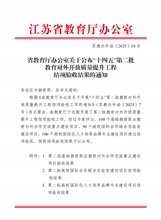 近日,江苏省教育厅办公室下发《关于公布“十四五”第二批教育对外开放质量提升工程结项验收结果的通知》(苏教办外函〔2025〕18号),公司软件工程专业顺利通过“国际化人才培养品牌专业建设项目”结项验收。