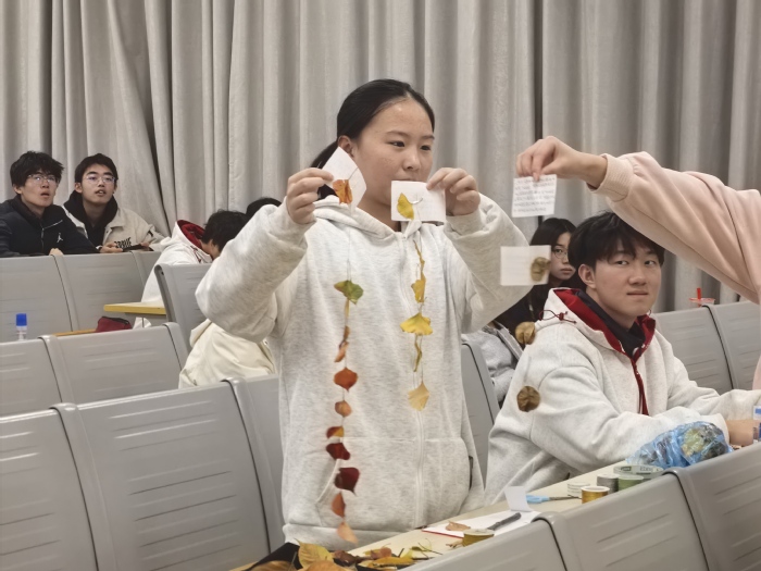 创作结束后,参赛同学依次分享作品寓意。有的围绕《小王子》主题,深情讲述了利用落叶自然质感传递的陪伴;有的介绍玫瑰作品时,提到借不同色彩叶片的叠搭,还原自然花朵的生动与温柔;还有的分享秋树作品,通过深浅叶片的组合,呈现秋日树木的层次与暖意。