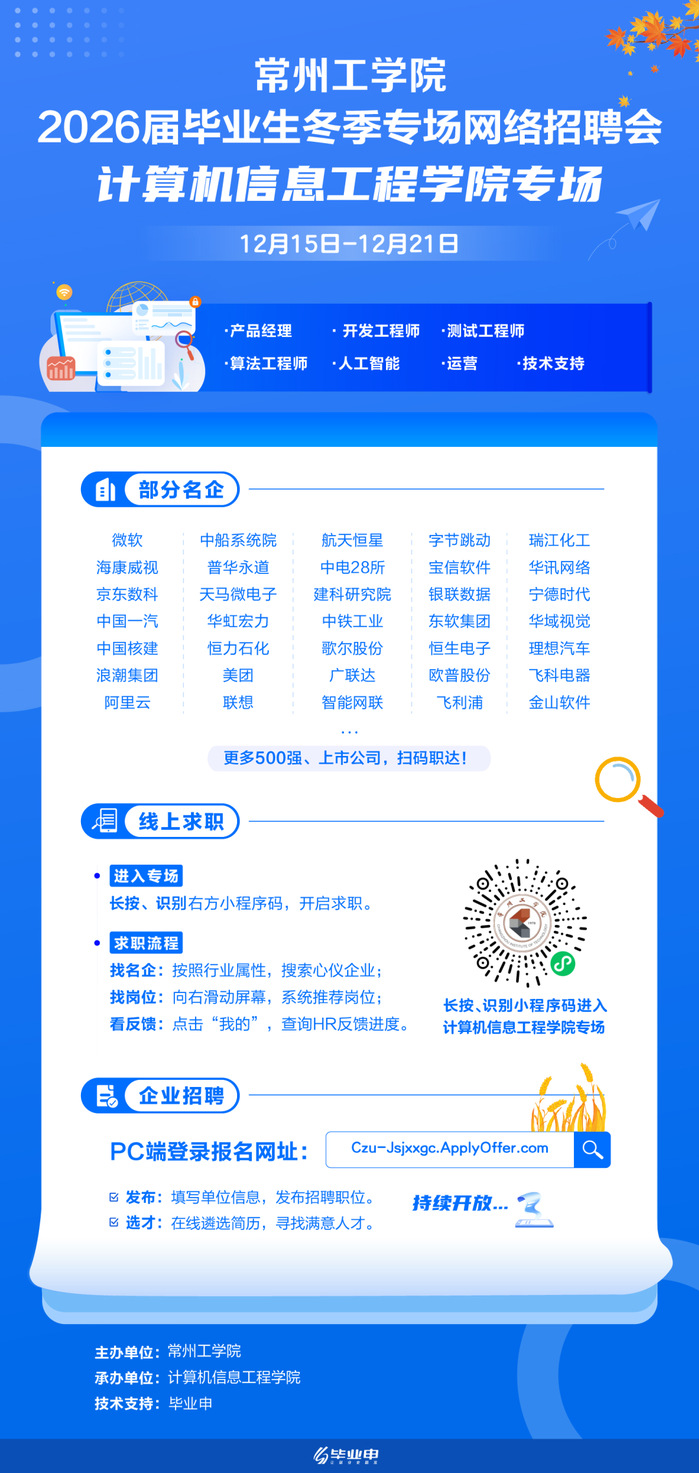 为助力2026届毕业生高质量就业,12月15日,BBIN宝盈集团2026届毕业生冬季专场网络招聘会正式启动,本次专场招聘将持续至12月21日,为学院毕业生搭建起精准对接优质岗位的云端桥梁。