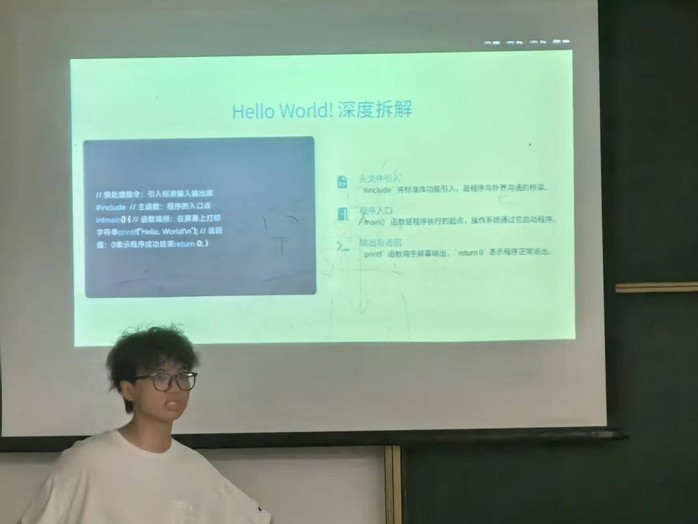 社团负责人孙堂庆同学通过现场编码演示,系统解析了顺序、分支与循环三种基本程序结构,并演示如何将实际问题转化为逻辑步骤,使新生直观体会到编程的结构化与逻辑严谨性。